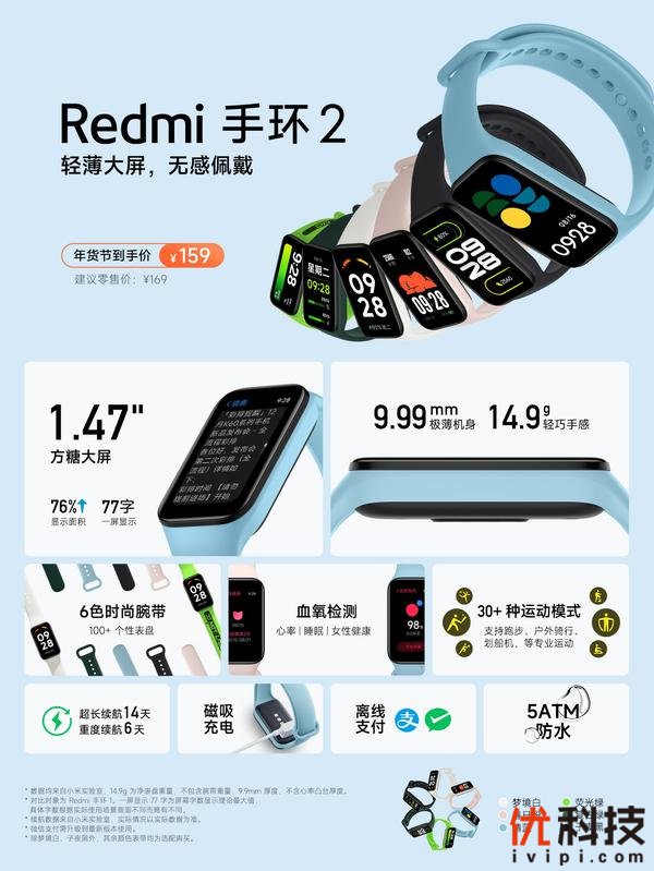 Redmi Watch 3售价499元;Redmi手环2首发限时优惠价159元;Redmi Buds 4青春版首发限时优惠价139元。三款Redmi早春系列单品即日起全渠道同步开售。