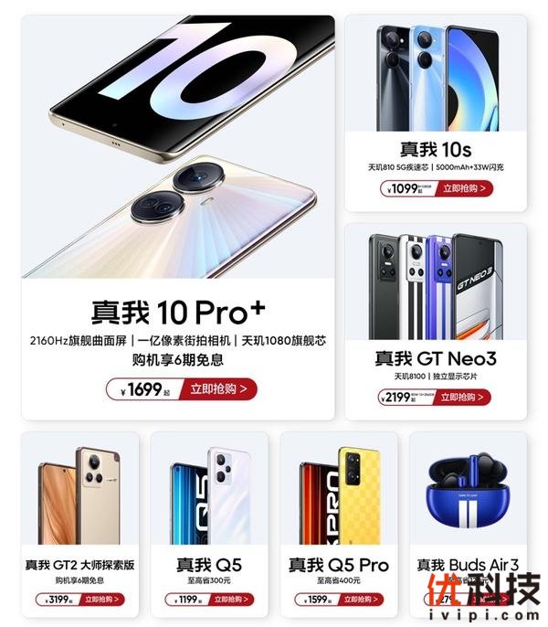 此次真我潮玩年货节,真我10 Pro+售价为1699元起,并且可享6期免息分期,提前加购还有更多惊喜福利。除此之外,大内存越级的真我10s售价为1099元起;潮玩电竞旗舰真我GT Neo3(80W,12+256GB)低至2199元起;年度质感旗舰真我GT2大师探索版3199元起;42dB旗舰降噪耳机真我Buds Air3仅需279元起。