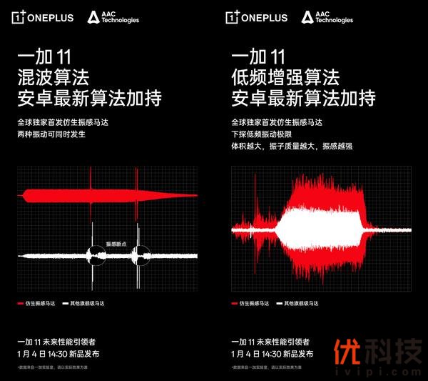 一加 11 与瑞声科技联合投入了近百名各领域高级研发工程师,耗时近 1 年,投入近千万研发费用,实现软硬件多项技术突破,打造全新的第四代马达技术平台——全相磁路技术平台。仿生振感马达是目前安卓最大的 X 轴线性马达,高达 602 立方毫米。超大体积带来强劲有力的振感。此外,一加采用全新的磁路设计,带来全新的全相磁路技术,实现超快启停反应,让振动感即按即振,清脆不拖沓。在RichTap的低频增强算法加持下,仿生振感马达能呈现更为细腻的振动效果,游戏的风吹草动、水波荡漾,甚至是轻微的呼吸声,都能通过振动感知得一清二楚。一加 11 还联合瑞声科技打造混波算法,打破手机马达单一振动的局限性,首次在手机上实现两种振感叠加呈现的振动革新。