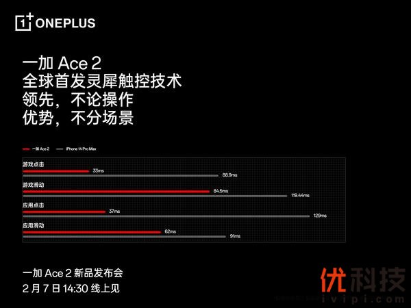 2月2日,一加手机官方公布,一加Ace 2将全球首发1.5K灵犀触控屏,支持120Hz高刷新率、高频 PWM 调光,带来流畅顺滑的视觉体验。一加 Ace 2搭载了独家自研的灵犀触控技术,实现了对手机触控系统的全链路优化,全面提升触控跟手性、精准度和稳定性,多项触控数据超越iPhone 14 Pro Max,树立“触控新标杆”。
