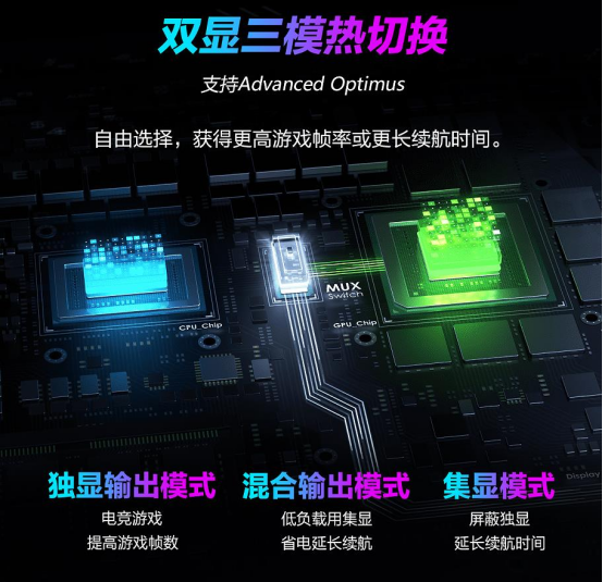 显卡方面,配备的NVIDIA GeForce RTX 4080/4090笔记本电脑GPU均采用NVIDIA 最新Ada Lovelace架构,能耗比、AI性能、光追能力较上一代最高提升2倍。基于第四代Tensor Core 和光流加速器,为电竞玩家带来了全新的DLSS 3技术,在不降低画质和响应速度的前提下,提供高帧、高画质的游戏体验。同时支持双显三模显卡热切换技术,兼顾续航与性能,在独显模式下实现性能跃升,出色的图形性能可让玩家畅玩热门游戏,帮助创作者高效产出作品;而在集显模式下,则可彻底关闭独显,大幅延长离电使用时长。