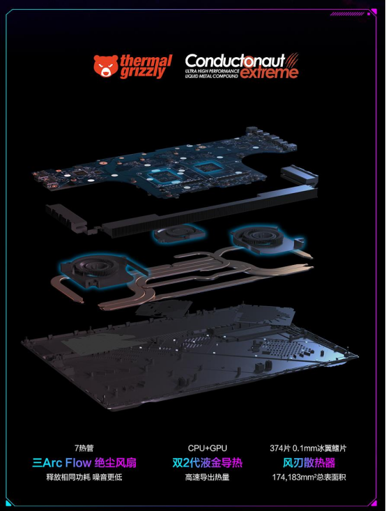 为了实现更强的性能释放以及给予玩家舒适的操作体验,枪神7 Plus超竞版的散热系统也迎来大幅升级,采用最新的冰川散热架构3.0,三绝尘风扇+风刃散热器+七热管的组合,配合ROG独有的内吹式散热,优化内部风道,极大提升散热效率,并且CPU与GPU均采用了第二代暴力熊液态金属,快速传导核心热量,杜绝积热,即使长时间处于高负载游戏状态也能保持冷静。全新引入三风扇设计,均衡气流量降低噪音。