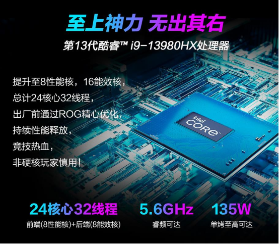 ROG枪神7 Plus超竞版首发搭载13代英特尔酷睿i9-13980HX处理器,可选配RTX 4080/4090独显。i9-13980HX采用能效混合架构,拥有24核32线程规格,最高睿频达到5.6GHz。通过ROG性能优化设计,增强模式下可实现135W持续性能释放,性能媲美桌面级i9-13900K处理器。内置64GB DDR5内存+2TB PCIe 4.0 SSD,多任务处理更加流畅,海量游戏随心存储。