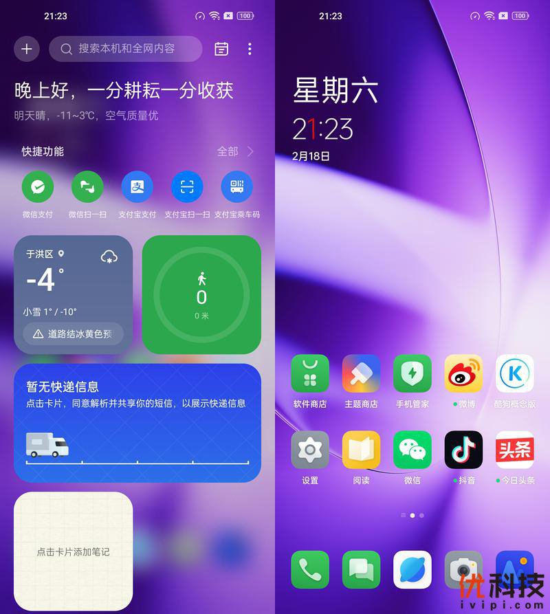 系统UI设计方面自定义程度还是非常高的,细节方面非常精致,例如经典的时间显示部分逢“1”变红就非常有个性,而在负一屏设计上也是集成了全局搜索以及日历和时间段问候语功能,其他包括天气温度空气质量都有提示。而快捷功能方面还集成了常用的微信支付等快捷操作图标。