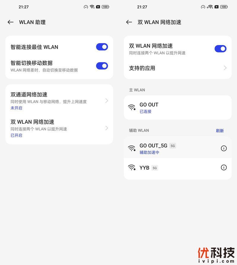 至于系统WLAN网络方面也是功能较为全面,支持智能连接最佳WLAN以及智能切换移动数据,并且还支持双通道网络加速和双WLAN网络加速功能,实测网络速度和稳定性方面的表现还是非常出色的。