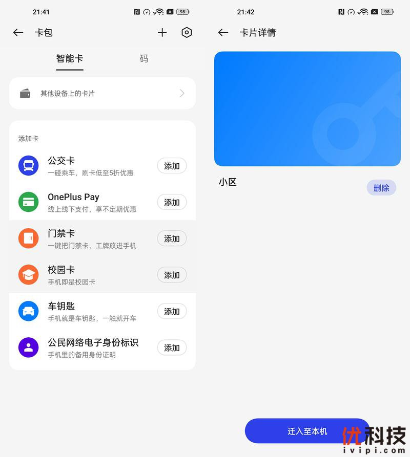 同时在系统内的卡包中,还可以添加公交卡、门禁卡、校园卡等操作使用,另外若在同账号其他手机中保存有已添加的门禁卡等数据也可以迁入到本机进行使用。