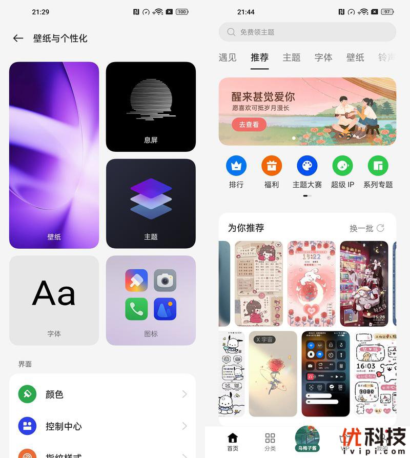 而在系统个性化方面,用户可以自由选择多种壁纸、主题、熄屏显示以及字体和图标的自定义,另外如界面颜色、控制中心等均支持,同时在主题商店中还会实时增加海量主题元素可供选择。
