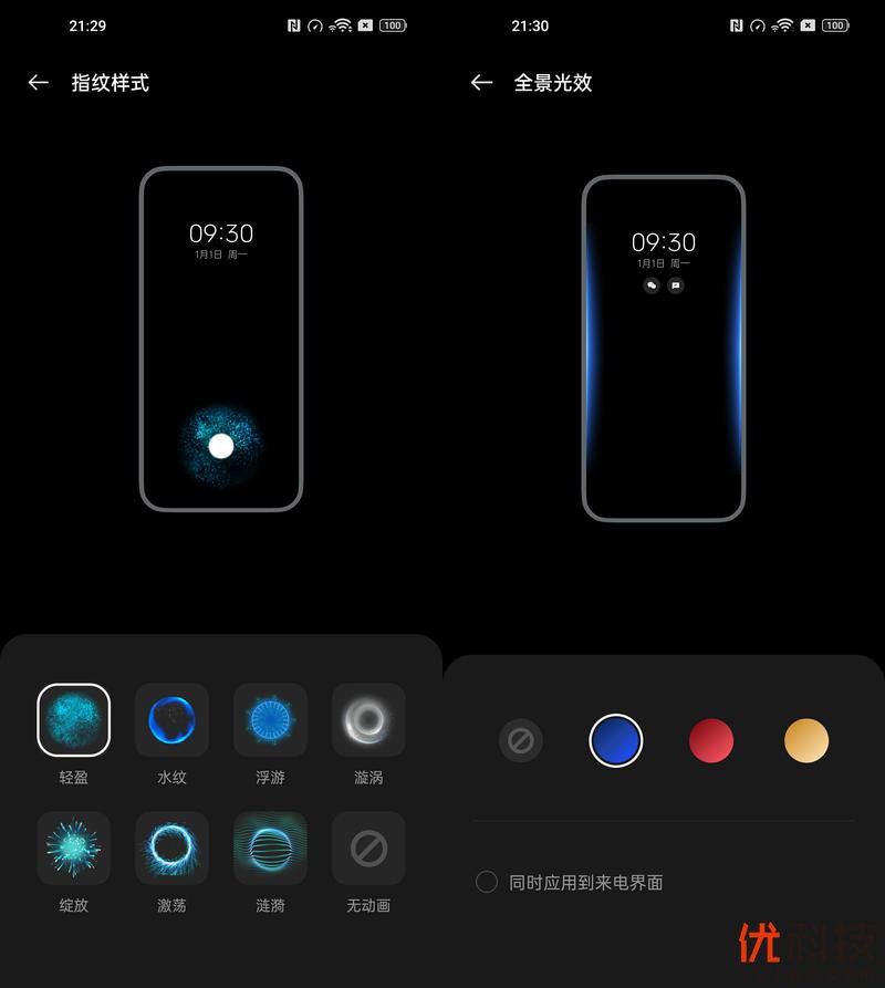 至于指纹图标显示样式和全景光效都支持自定义,让用户打造出不一样的体验。