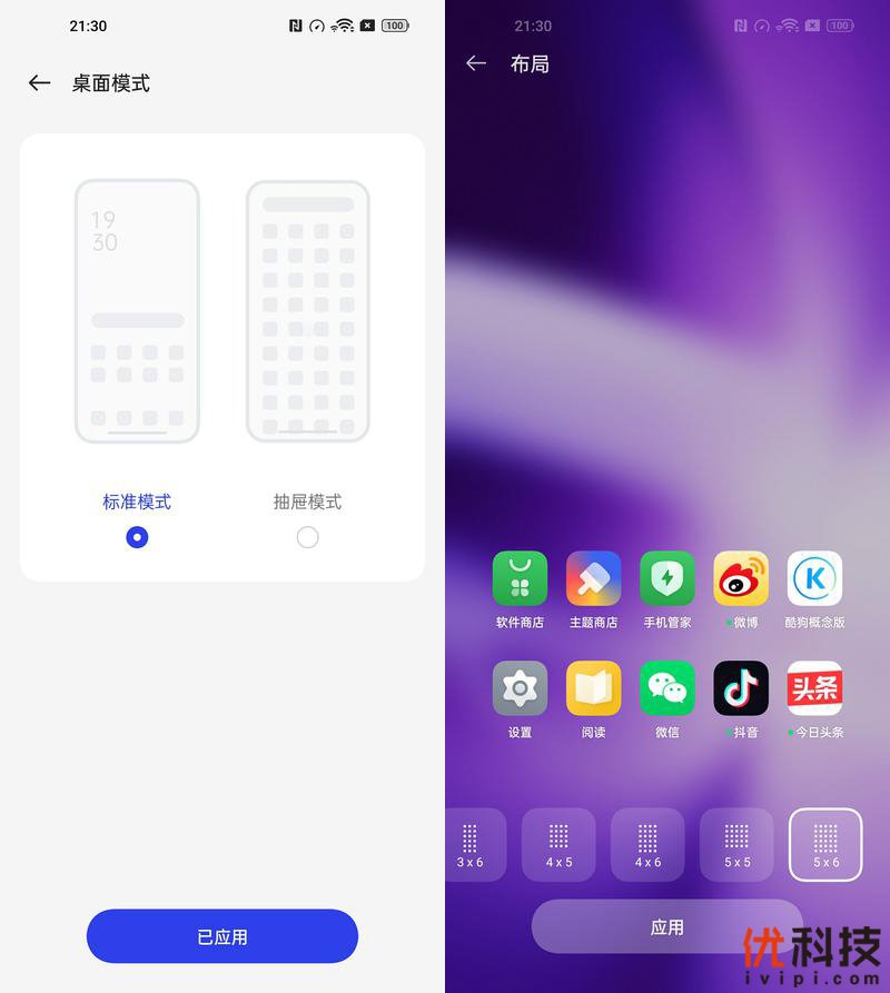 虽然如今手机屏幕尺寸的增加,页面显示内容也是更加的丰富,在一加11的系统中用户可以设定桌面模式,例如标准模式和抽屉模式可供选择,另外如桌面图标布局也有着多项可选。