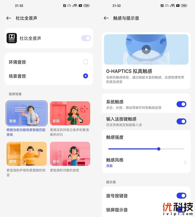 另外该机还支持杜比全景声,用户可以选择场景音效来体验,而震感设计方面,得益于搭载了目前安卓最大的X轴线性马达,在设置中用户可以对系统振动进行更加细节的自由设定。