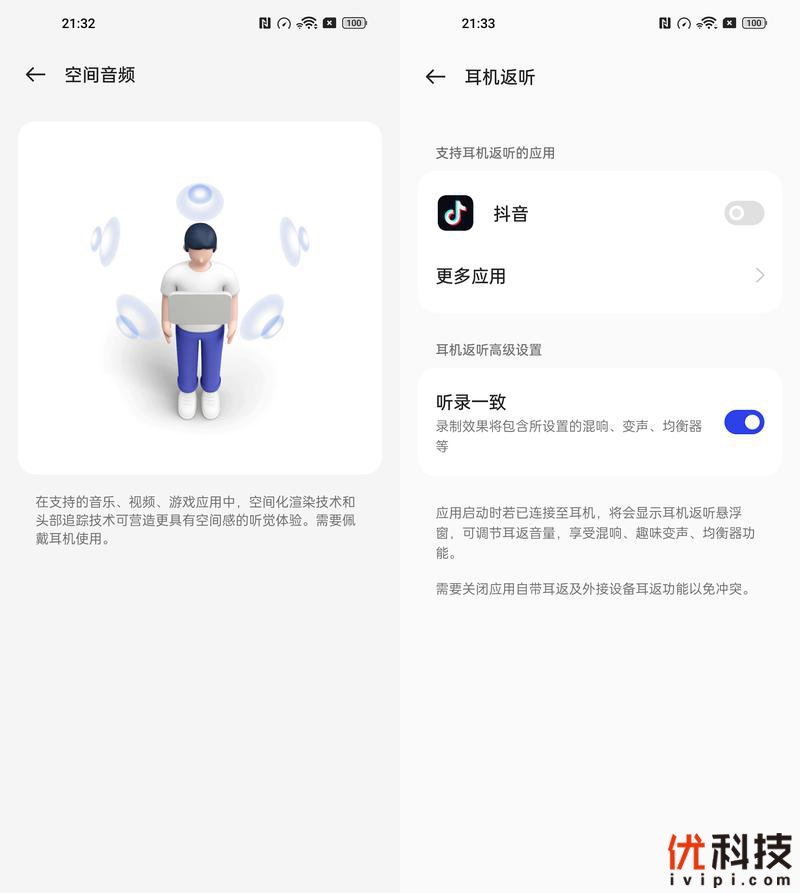 一加11还支持空间音频功能,在音乐、视频、游戏等应用时会带来更加具有空间感的体验,只不过前提是需要佩戴耳机来使用,另外耳机返听功能也是非常的实用,开启后起到了耳返的作用,便于在当下短视频爆火的大环境下自拍应用。