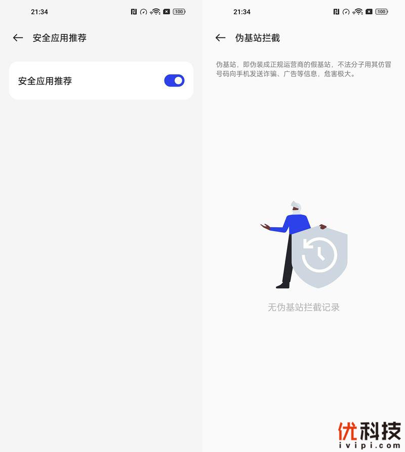 而在应用安装方面还支持安全应用推荐功能,开启后将会对需要安装的应用进行审核检查,避免手机出现病毒植入的状况。同时系统内还具备伪基站拦截功能,尽最大程度的减少用户的财产损失风险。