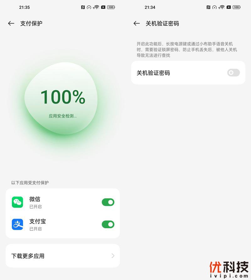 其它安全方面,该机还支持支付保护功能,开启后将会保护用户的支付应用,减少被盗的风险,而关机验证密码功能也是非常的贴心,即便是手机丢失后在关机时需要锁屏密码验证,可以进一步的增加找回手机的几率。