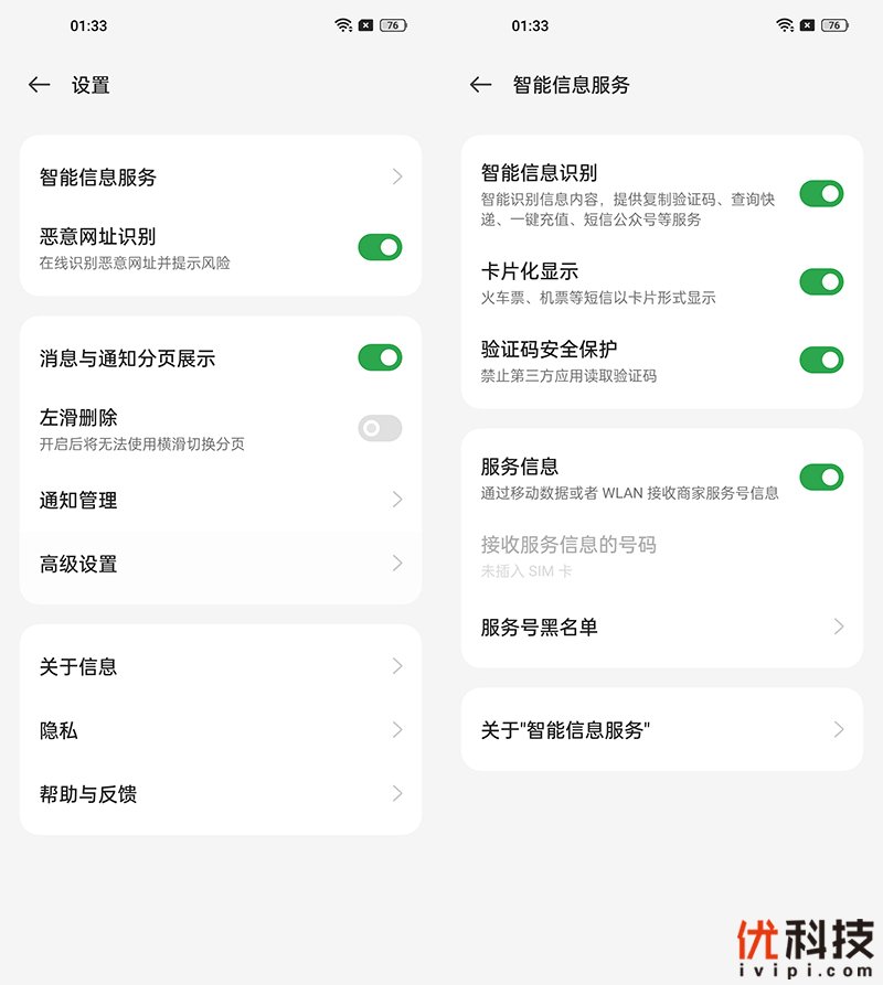 在信息应用中还具备智能信息服务功能,同时还可以开启恶意网址识别功能,开启后可以智能识别信息内容,以及验证码的安全保护,并且对信息中心网址进行风险提示,避免上当受骗。