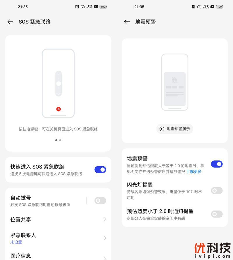 至于SOS紧急联络功能也是非常有用,在紧急情况下可以自动拨号求助,并且还能够预设医疗信息和紧急联络人以及位置共享功能,此外地震预警功能建议开启,开启后将会在近期时刻收到预警,避免损失。