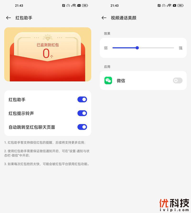 系统内还集成了红包助手功能,开启后将会有微信红包的铃声提示,并且支持直接跳转至红包聊天页面,抢红包更加的容易,同时还支持视频通话美颜功能。