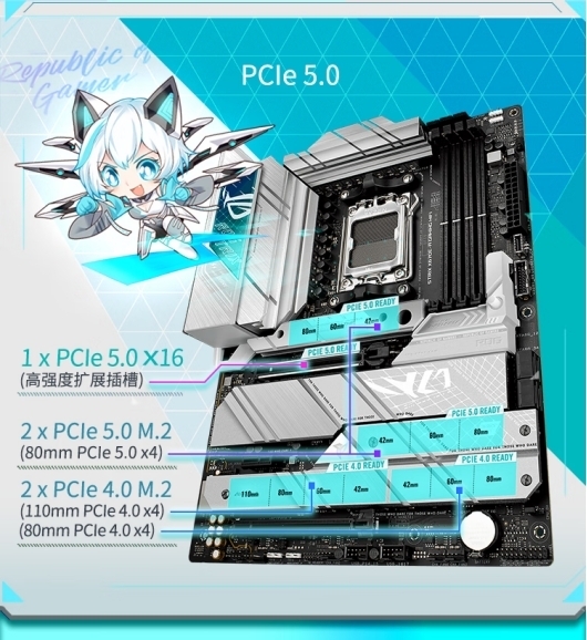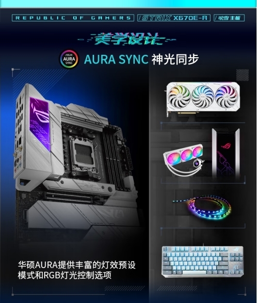 华硕X670E吹雪主板支持AURA SYNC神光同步,板载3个第二代可编程ARGB灯效接针和1个RGB灯效接针,不仅可与其他ROG白色配件打造全家桶,搭配其他颜色硬件也十分炫酷,更有雪武战姬形态出道应援打Call,潮玩竞装,满血战力!