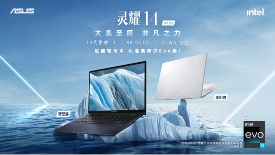 灵耀14 2023作为一款品质高颜轻薄本,主打轻薄、高颜值、长续航。此次新品推出“冰川银”和“夜空蓝”两款全新配色,取色自然冰川和暗夜星空,简约精致的商务风格一如既往地凸显了灵耀高端商务本应有的出众气质。