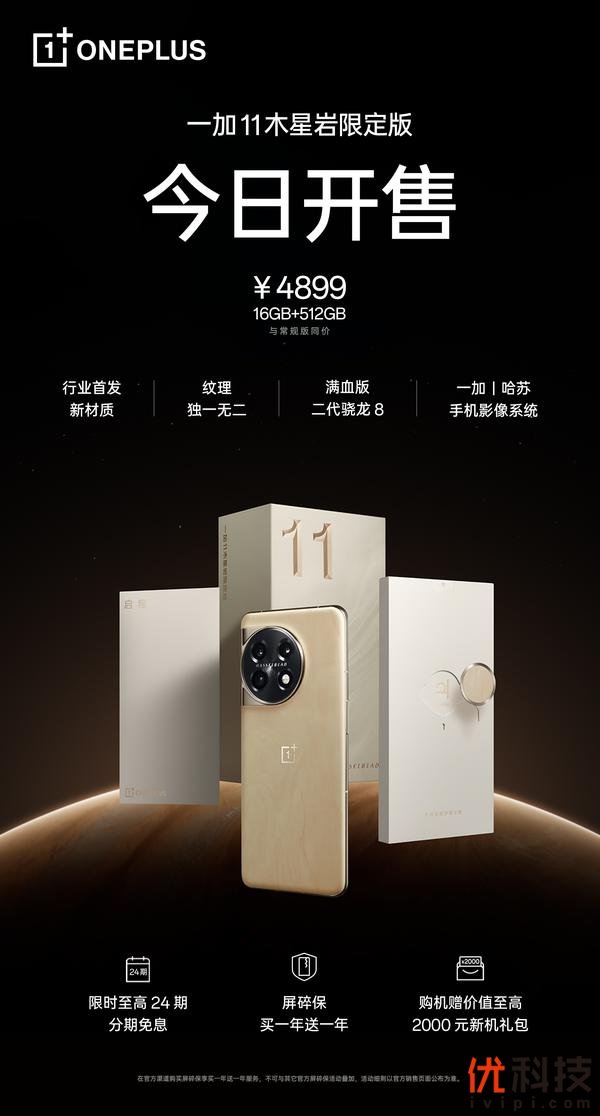 一加 11 木星岩限定版采用第二代骁龙 8 移动平台,搭载内存基因重组技术、超帧超画引擎、仿生振感马达、游戏云计算专网四大自研黑科技,在内存管理、游戏画质、马达体验、弱网游戏上打破安卓手机体验的四大不可能。目前一加 11 木星岩限定版已经开售,16GB+512GB 版本售价 4899 元,现在购买可享至高 24 期分期免息,购屏碎保买一年送一年,还有至高 2000 元新机礼包,用户可在 OPPO 商城、京东、天猫及一加线下授权门店等全渠道进行购买。