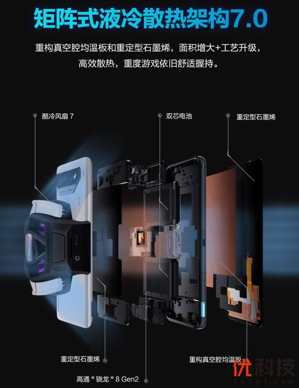 腾讯ROG游戏手机7 Pro则采用了矩阵式液冷散热架构7.0 Plus,新增酷冷风洞系统,于机身背面左侧中间位置搭载了业内首创的酷冷风洞阀设计,其由50多个精密零件构成,所采用的高扭力步进式马达内置防跌落机制,可避免碰损内部结构,提升使用寿命。酷冷风洞阀将在连接酷冷风扇7后自动打开,将冷却气流直接带至鳍片式微型真空腔均温板,通过冷风对流对SoC实现快速降温。