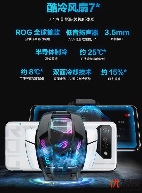 对于想要获得极致高能体验的极客玩家而言,还可搭配酷冷风扇7一同使用,其内置叶片数量提升近3倍,内置半导体制冷芯片和AI温控制冷系统,可通过侧边接口与手机相连,实时监测并智能匹配不同冷却模式,新增的“前侧出风”设计最高可对屏幕降温8℃,实现双面高效冷却。此外,其还是全球首款搭载了扬声器的风扇,低音扬声器可提升77%的低音效果,将手机打造为2.1声道便携式影院系统,听觉体验再度提升。