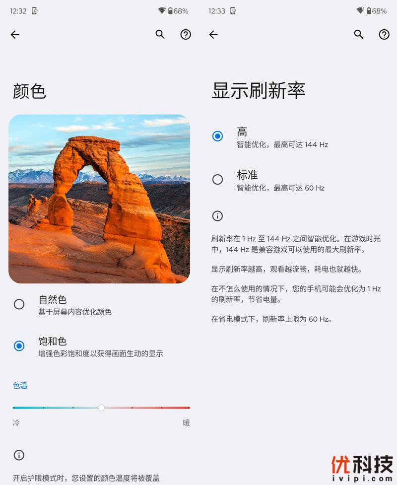 至于屏幕显示方面,系统内可选择自然色和饱和色两种色彩模式,并且支持手动调节屏幕色温,找到适合用户的观感设置,而刷新率方面提供了高和标准两档可选,默认选择高即可,因为moto razr 40的屏幕支持LTPO自适应刷新率,这样可以更加地节能。同样,moto razr 40也支持息屏显示功能,开启后可以在不亮屏的状态下预览部分消息,在设置中也可以手动选择息屏显示内容。