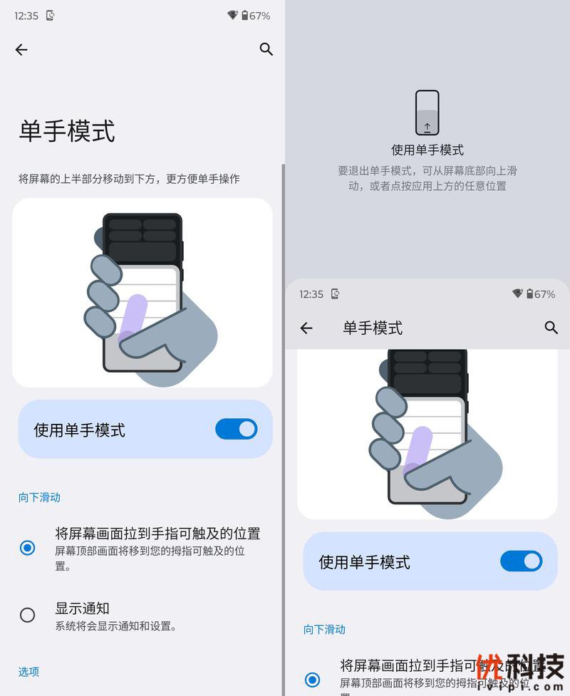 虽然moto razr 40的机身宽度仅为73.95mm,单手操控压力不大,但是屏幕上方的图标要单手操控还是有些难度的,所以系统内集成了单手模式,开启后单手操作不再是问题。