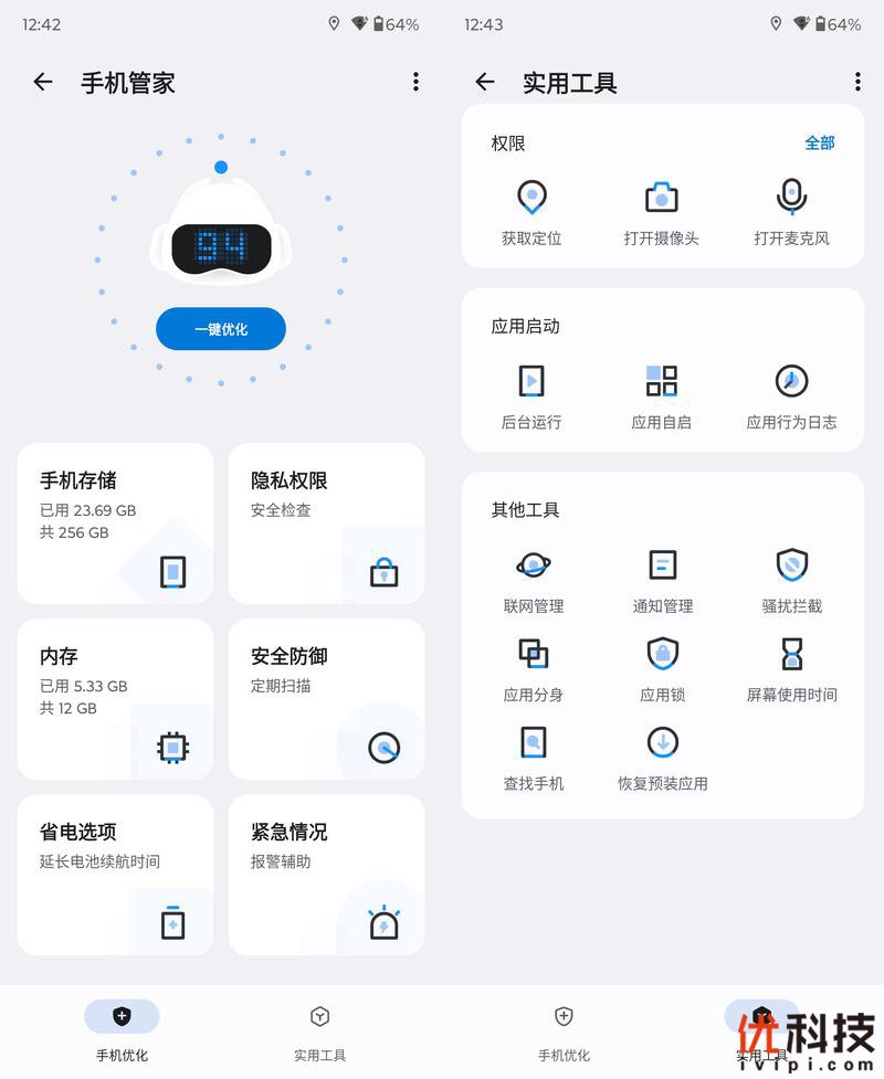 系统内置了手机管家功能,功能还是比较全面的,不仅可以了解内存和存储的实时状态,还具备联网管理、骚扰拦截以及应用锁等实用功能。