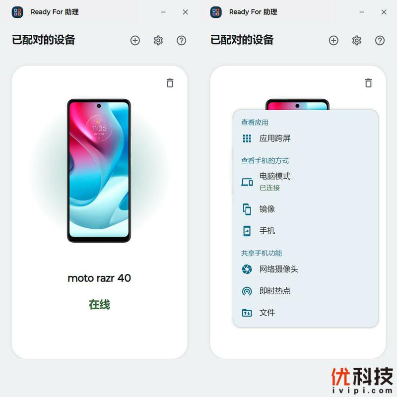 例如moto razr 40和电脑进行连接,可以在电脑端控制手机,同时可以让手机作为电脑的网络摄像头或者即时热点或者调用手机内的文件来使用。