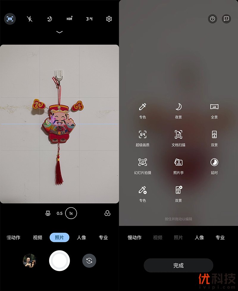 至于拍照取景页面操作也是非常的直观易于上手,首先取景窗上方为快捷控制选择,例如闪光灯、微距、HDR以及设置等,取景窗下则是焦段切换以及相机模式选择,其中相机模式共有慢动作、视频、照片、人像、专业以及更多所组成,而在更多选项中则是提供了专色、夜景、全景、超计划值以及非常好玩的双景等功能。