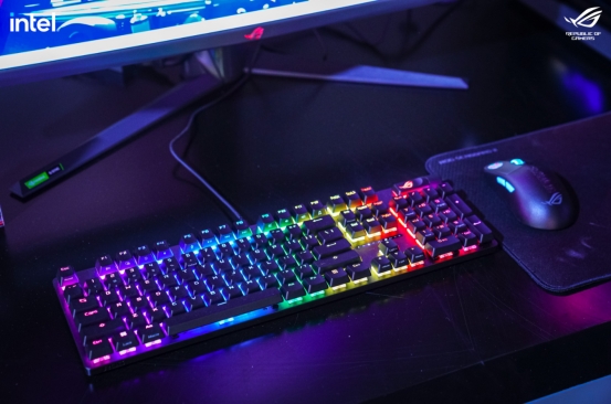 针对玩家们多样化的需求,现场还准备了全新的ROG游侠2系列机械键盘,供玩家们参观和体验。设计方面,ROG游侠2系列提供了自研RX光轴和NX机械轴两个系列,其中,RX光轴提供顺滑轻盈的RX红,与段落感清脆的RX蓝两种手感,体验感极佳;NX机械轴则准备了线性NX雪武白轴和段落NX冰暴灰轴可选,并采用了3.6mm短键程设计,疾速响应,电竞必备!设计方面,ROG游侠2系列全新添加了底部吸音泡棉的配置,能够有效改善音效并降低抖动,提升手感表现。