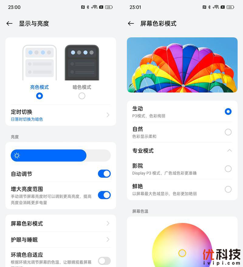 作为真我 GT5 Pro重点之一的屏幕在显示效果方面有着全面而又细节的功能可选,首先支持自定义模式,并且支持手动开启亮度范围达1000nit,同时还支持环境色自适应以及护眼和睡眠设定,非常的全面,而在色彩模式中支持生动、自然、专业三大类可选,并且在专业模式下可选影院或者鲜艳两种色彩配置,另外还支持屏幕的冷暖色调节。