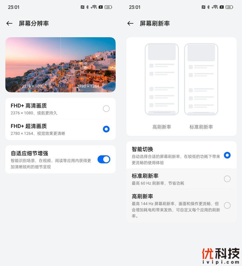 真我 GT5 Pro搭载的屏幕分辨率为1.5K黄金分辨率,而在系统内还可以选择有助于续航的1080P分辨率,并且可以开启自适应细节增强功能,至于刷新率方面则支持智能切换、标准以及高刷三档可选,默认选择智能切换即可。