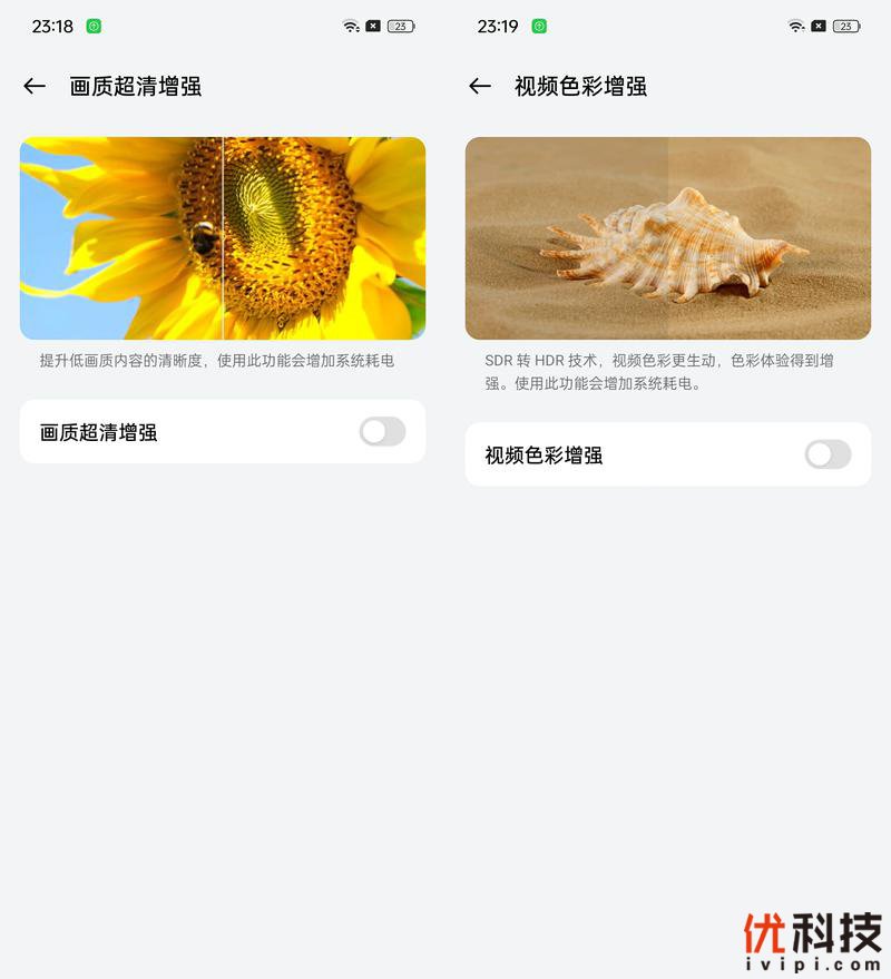 而在画质优化方面则是可以开启画质超清增强功能,开启后将会提升低画质内容的清晰度。而视频色彩增强功能则是SDR转HDR,让色彩更加的生动。