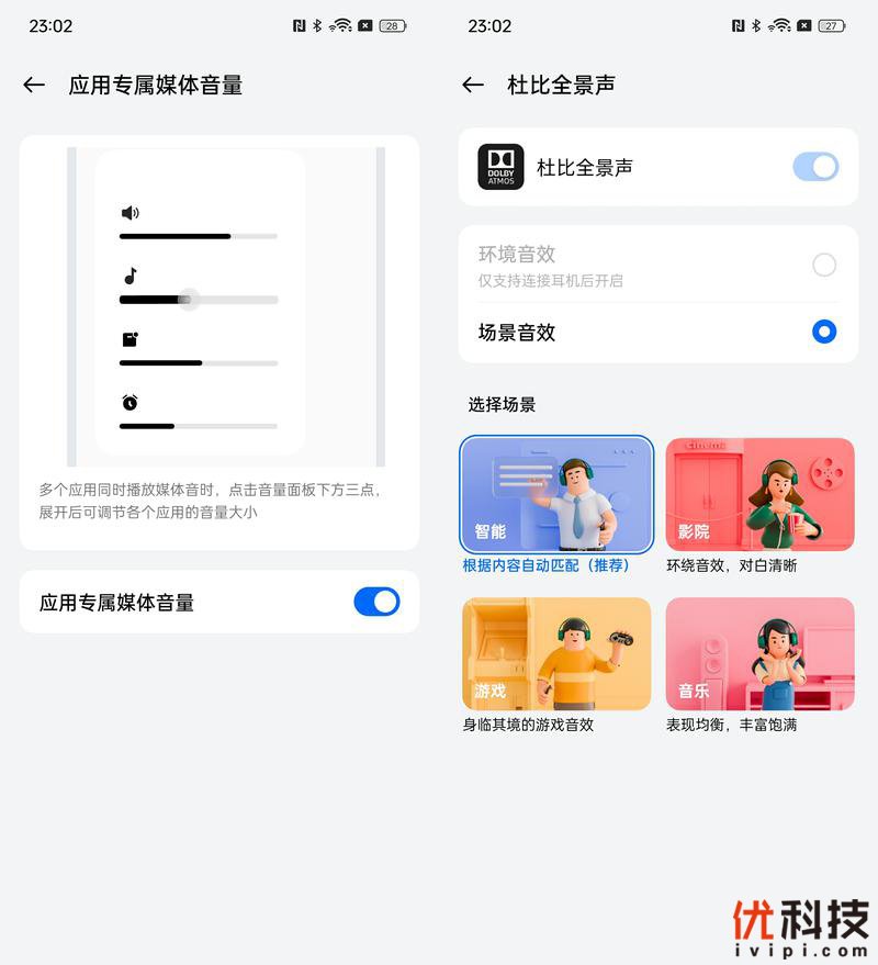 关于音量方面,真我 GT5 Pro则是支持应用专属媒体音量设置,开启后用户可以在多个应用同时播放媒体音时,来调节各个应用的音量,另外在杜比全景声设置中可以选择适用的场景来体验。