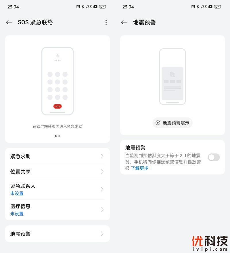 在系统内可以设定相关SOS紧急联络功能,开启后将便于在紧急时刻脱险,而地震预警功能也是非常的有用,建议开启。