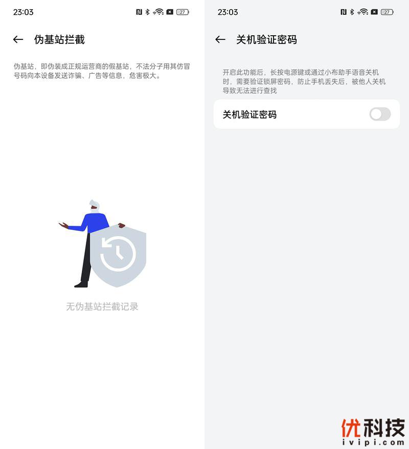 安全防护方面可以开启伪基站拦截功能,减少被骗的概率,而关机验证密码功能也是非常的实用,若手机意外遗失后,防止他人关机导致无法进行寻回。
