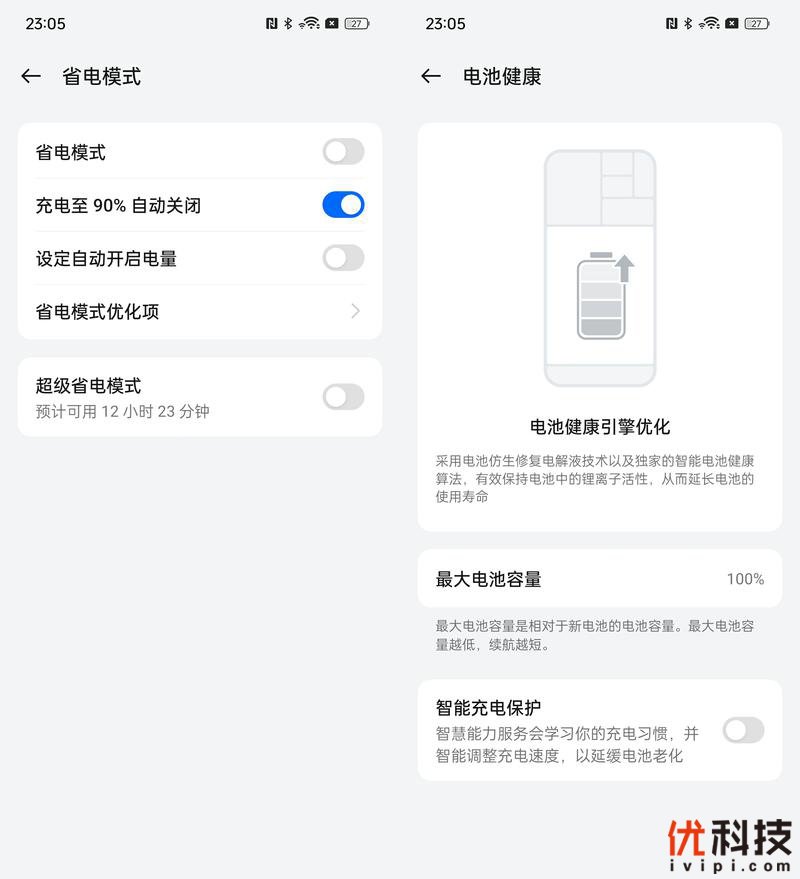 关于电池的设定也是比较全面,可以自动开启关闭省电模式,同时支持超级省电功能,另外在系统内还可以看到本机挡墙的电池寿命,以及开启智能充电保护功能,以延缓电池老化。