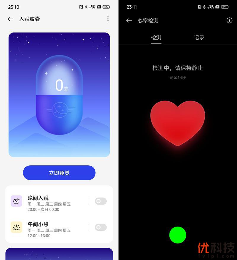 在系统内的realme实验室内,可以开启入眠胶囊功能,开启后则会让手机进入到锁定模式,以便让用户快速进入梦乡,同时在realme实验室内还支持心率监测功能,仅需将手指按压指纹识别区域即可。