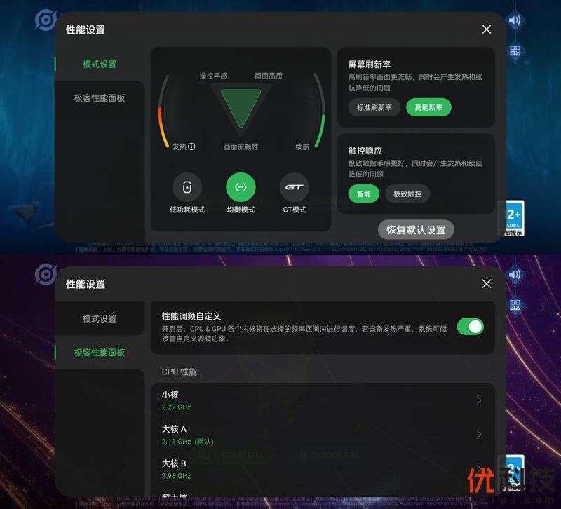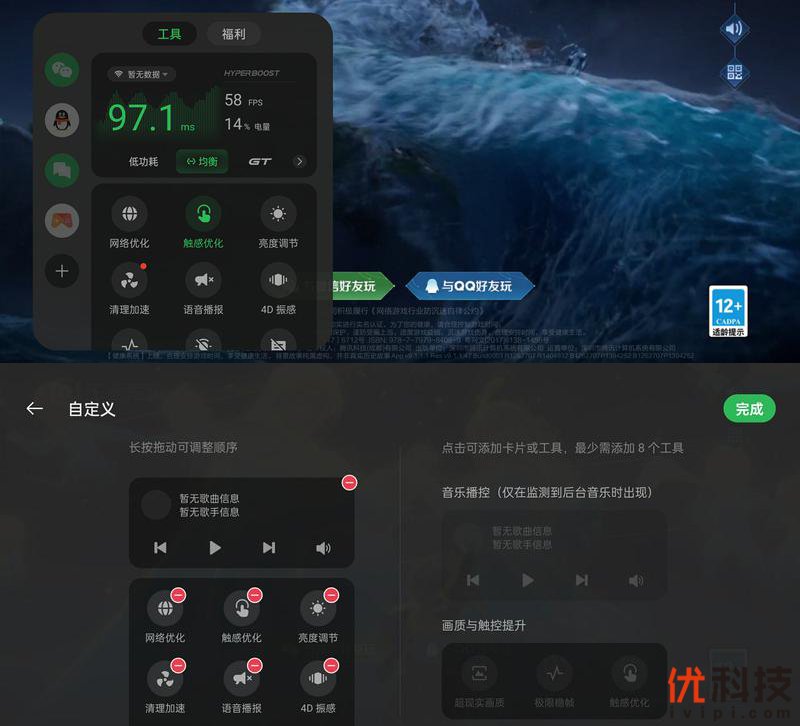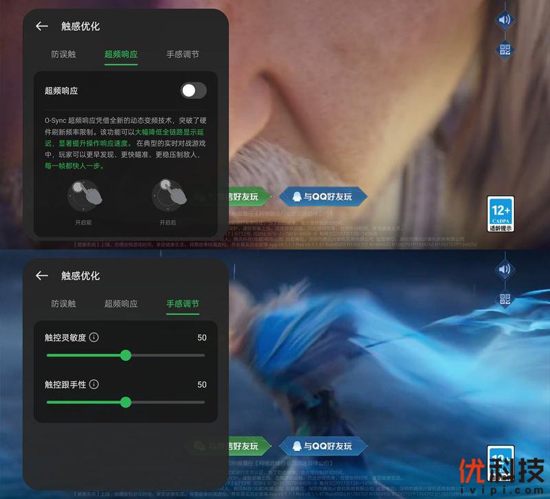 在游戏助手中集成了触感优化功能,其中包含防误触以及超频响应和手感调节,开启后可以大幅降低全链路显示延迟,提升游戏体验,而手感调节则可以手动调节触控的灵敏度和跟手性。