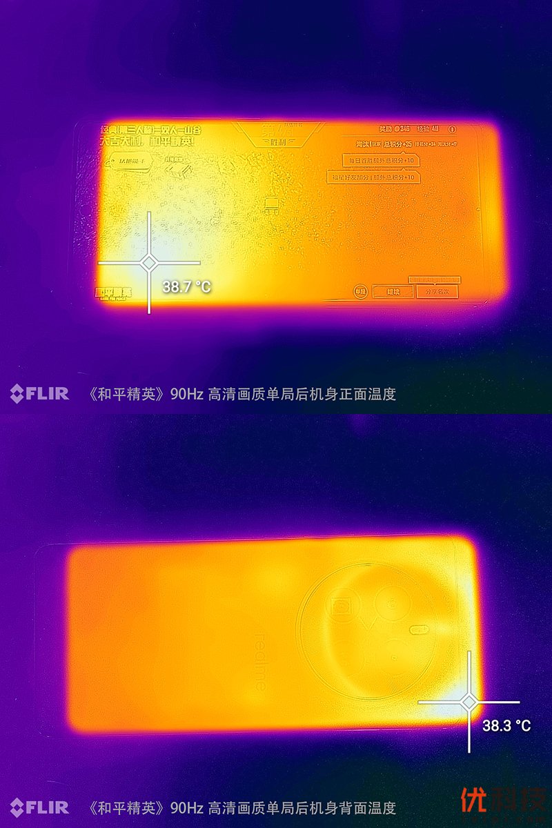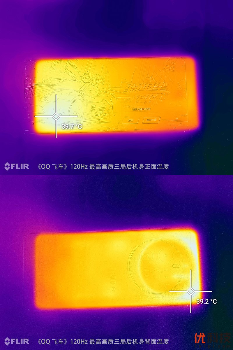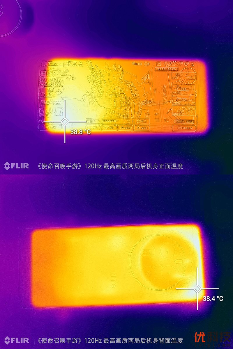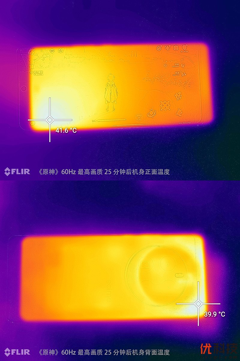 首先是120帧最高画质王者荣耀两局后的温控表现,机身正面最高39.4℃,而机背最高为38.8℃,游戏中并没有特别明显的发热,而从热成像照片中也可以看出,除去最高发热点,整体的温度控制还是较为均匀的。至于同为120帧最高画质的QQ飞车和使命召唤手游在分别运行三局和两局后温度也没有突破40℃,可见GT5 Pro的实力还是不错的,而在体验完90帧高清画质和平精英后依旧得到正反面仅为38℃左右的温控表现,可见该机的整体优化还是不俗的,而即便是60帧最高画质的原神在25分钟的体验后也仅机身正面最高温度达到41.6℃,可见3VC冰山散热系统的实力真的很强悍高效。