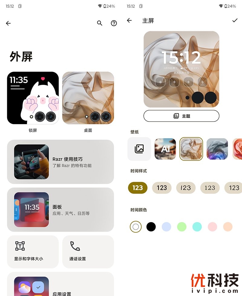 另外moto razr 50的外屏还有多达22种主题可选,同时包括壁纸、时间样式以及时间颜色都可以自定义设计,并且主屏页面还支持4个快捷小程序设定,自由度非常高。另外如外屏应用控制、天气等面板均支持自定义控制,可以说moto razr 50的外屏自由度和实用性非常强。