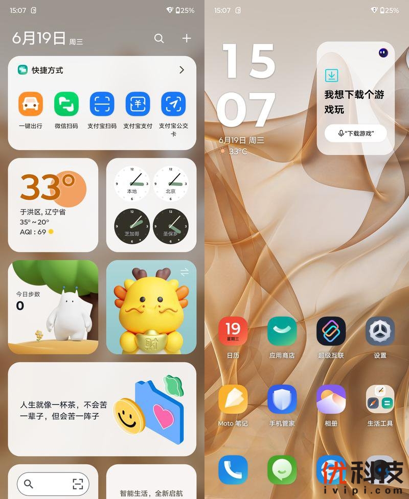 首先是页面设计方面,桌面图标更加的灵动,并且自定义程度更高,同时在负一屏依旧集成了多项快捷方式,例如一键出行、微信扫码等等,并且还集成了天气、各地时区时间以及运动步数等等。