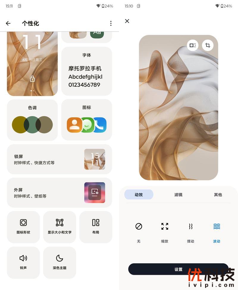 至于桌面个性化方面,首先主题壁纸自定义程度很高,同时还支持字体、色调、图标、锁屏的自由调节,并且还支持壁纸的动态、滤镜自定义功能,整体上很提升档次。