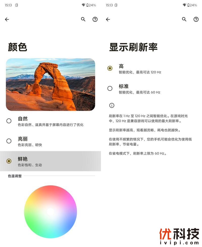 至于屏幕显示方面,系统内提供自然、亮丽以及鲜艳三种可选,并且支持自定义色温调节,至于刷新率方面则是提供了高和标准两档,默认选择高即可,由于moto razr 50的屏幕支持LTPO自适应刷新率,这样可以更加地节能。同时还支持熄屏显示功能。