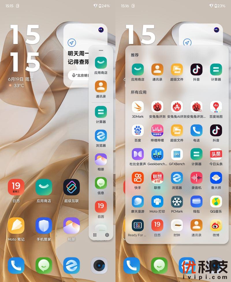 moto razr 50还支持便捷侧边栏功能,默认侧边栏为单列设计,集成了常用功能,同时在侧边栏中还可以开启手机内的所有应用,临时划出使用还是很方便的,避免了繁琐的应用切换。