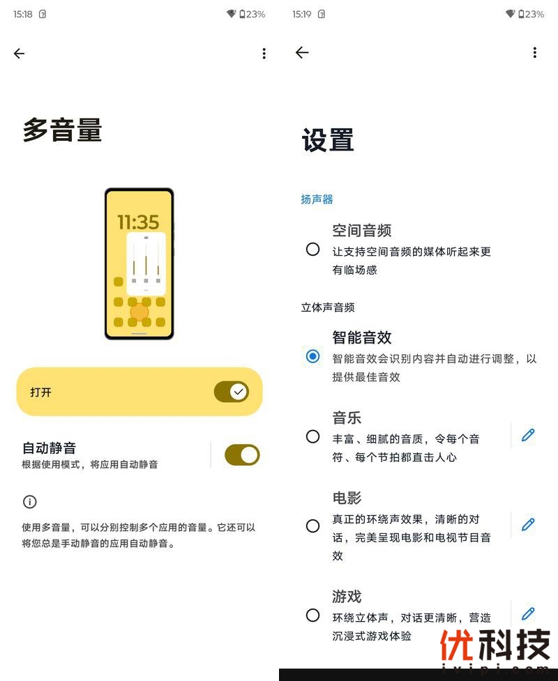 moto razr 50不仅搭载了立体声扬声器,同时还支持杜比全景声,同时该机还支持多音量控制功能,开启该功能后在调节音量时即可进行单程序音量控制了。另外还支持自动静音功能,开启后将会根据使用模式自动静音,更加的方便了,而在音效方面也是有着多档可选,可以选取适合不同场景的音效表现。