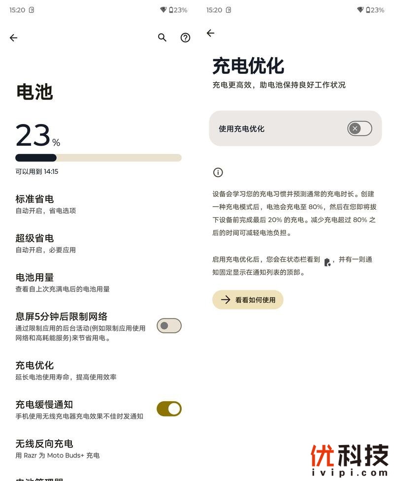 至于电池控制方面,系统内的电池选项中汇聚了多项实用功能,例如熄屏5分钟后限制网络,这点还是较为有用的,另外如智能充电优化以及充电缓慢通知等等。