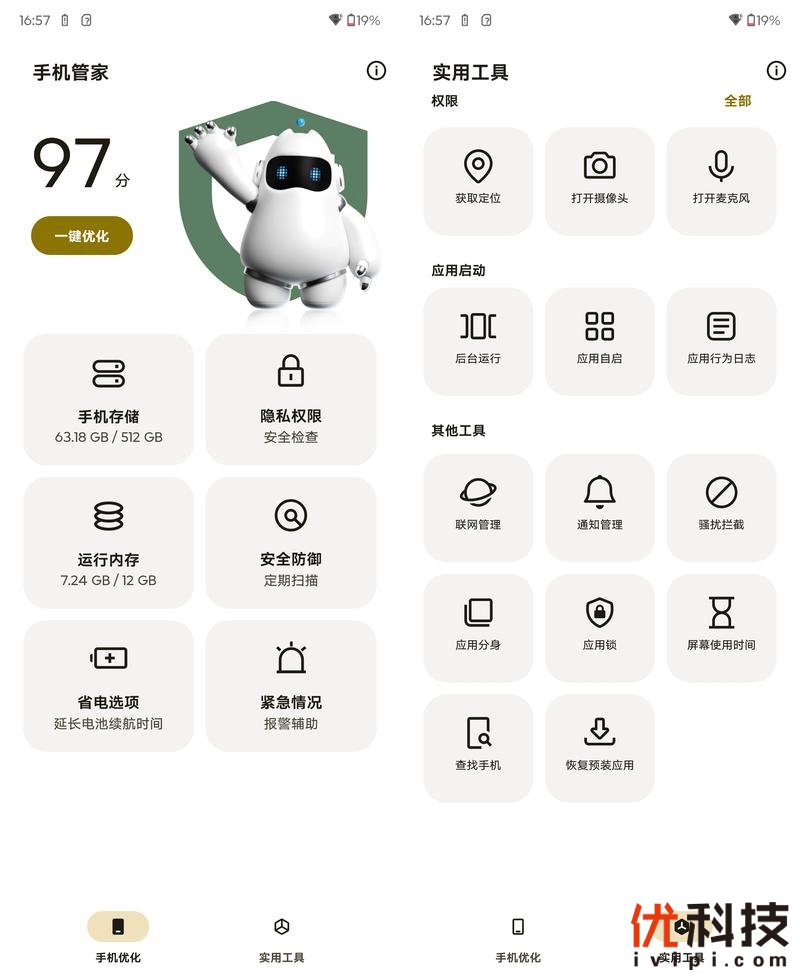 内置的手机管家功能也是非常全面,默认分为手机优化和实用工具两大类,可支持手机存储以及隐私权限的设定,并且支持紧急情况的报警辅助。而在实用工具中则是集成了应用自启管理以及联网管理和骚扰拦截,并且支持应用锁和查找手机等功能。
