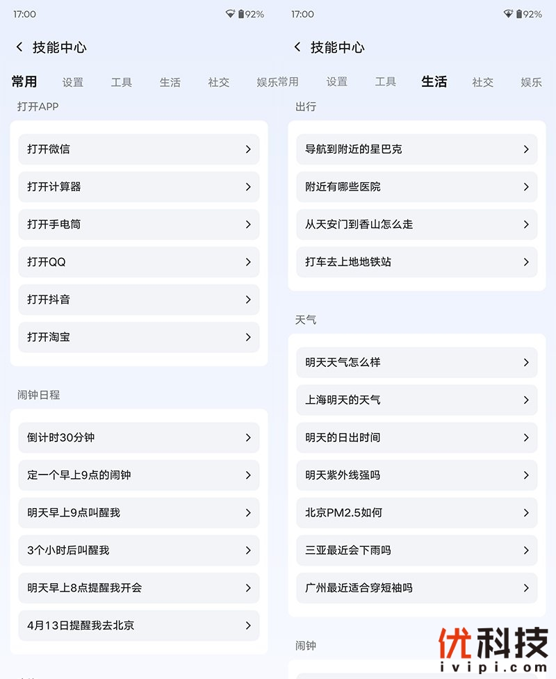 至于联想小天的实力远不止如此,在技能中心可以看到联想小天支持常用打开APP以及设置闹钟日常,同时还支持工具类、生活类以及社交等多种技能,期待大家进一步的开发。